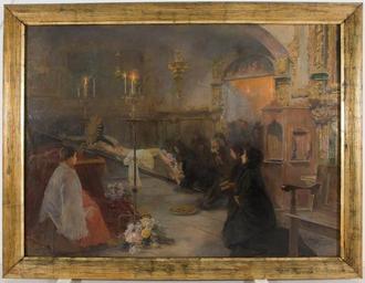 Keywords: Venite Adoremus 261.jpg Artwork Creator Arcadi Mas ca Interior d'una església iluminada amb espelmes i ornamentada amb decoració barroca Grup de dones i un home agenollats i vestits de negre adorant un Sant Crist inclinat Al costat de la imatge hi ha canelobres de ferro forjat rams de flors i un escolà assegut i amb sotana vermella between Oil on canvas cm Institution Biblioteca Museu Víctor Balaguer object history exhibition history credit line accession number place of creation Biblioteca Museu Víctor Balaguer-cooperation PD-Art PD-old-100-1923 Uploaded with UploadWizard Paintings in the Biblioteca Museu Víctor Balaguer Religion and art Dipòsit del MNAC a la BMVB