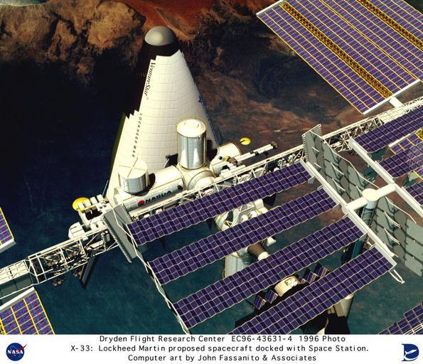 | Keywords: VentureStar by Lockheed Martin Docked with Space Station - Computer Graphic DVIDS715882.jpg en This is an artist's conception of the proposed NASA/Lockheed Martin Single-Stage-To-Orbit SSTO Reusable Launch Vehicle RLV docking with the International Space Station NASA's Dryden Flight Research Center Edwards California expected to play a key role in the development and flight testing of the X-33 which was a technology demonstrator vehicle for the proposed RLV The RLV technology program was a cooperative agreement between NASA and industry The goal of the RLV technology program was to enable significant reductions in the cost of access to space and to promote the creation and delivery of new space services and other activities that would have improved U S economic competitiveness The X-33 was a wedged-shaped subscale technology demonstrator prototype of a potential future Reusable Launch Vehicle RLV that Lockheed Martin had dubbed VentureStar The company had hoped to develop VentureStar early this century Through demonstration flight and ground research NASA's X-33 program was to have provided the information needed for industry representatives such as Lockheed Martin to decide whether to proceed with the development of a full-scale commercial RLV program A full-scale single-stage-to-orbit RLV was to have dramatically increased reliability and lowered the cost of putting a pound of payload into space from the current figure of 10 000 to 1 000 Reducing the cost associated with transporting payloads in Low Earth Orbit LEO by using a commercial RLV was to have created new opportunities for space access and significantly improved U S economic competitiveness in the world-wide launch marketplace NASA expected to be a customer not the operator of the commercial RLV The X-33 design was based on a lifting body shape with two revolutionary linear aerospike rocket engines and a rugged metallic thermal protection system The vehicle also was to have lightweight components and fuel tanks built to conform to the vehicle's outer shape Time between X-33 flights was normally to be seven days but the program had hoped to demonstrate a two-day turnaround between flights during the flight-test phase of the program The X-33 was to be an unpiloted vehicle that took off vertically like a rocket and landed horizontally like an airplane It was to have reached altitudes of up to 50 miles and high hypersonic speeds The X-33 program is managed by the Marshall Space Flight Center and was to have been launched at a special launch site on Edwards Air Force Base Due to problems with the liquide hydrogen fuel tank and the resulting cost increase and time delay the X-33 program was cancelled in February 2001 NASA Identifier NIX-EC96-43631-4 2009-09-23 Glenn Research Center https //www dvidshub net/image/715882 715882 2012-10-10 17 58 WASHINGTON DC US PD-USGov Edwards Air Force Base Images from DoD uploaded by Fæ VentureStar |