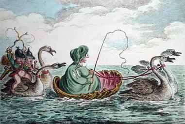 Keywords: Venus a la coquelle - or the Swan-sea Venus.JPG artwork en published 28 March 1809 by Hannah Humphrey 27 St James's Street 1809 London It represents a fat lady who is seated in a shell drawn by two swans She holds reins attached to the birds' necks and a carriage-whip is in her right hand A brace of Cupids also perched on swans are riding behind her as pages This is said to represent Mrs Jones of Swansea a celebrated whip frequently seen in Hyde Park driving a curricle It is a very correct representation both of her person and costume One of her attendants is said to have been a particular favourite Thomas Wright and Robert Harding Evans Historical and descriptive account of the caricatures of James Gillray H G Bohn 1851 p 479 etching hand-colored and aquatint Scan of an original Creator James Gillray 1809 PD-old-100 James Gillray Caricatures of the United Kingdom People with swans in art People with boats in art Animal-powered transport in art People with water in art Paintings of Cupido Whips in art Females with birds in art Sitting women in art Riding in art 1809 cartoons Seashells in art Facing right in art Animal-powered vehicles Swan transport in art Swans in art of the United Kingdom Swans in 19th-century art Caricatures of swans Venus Anadyomenes |