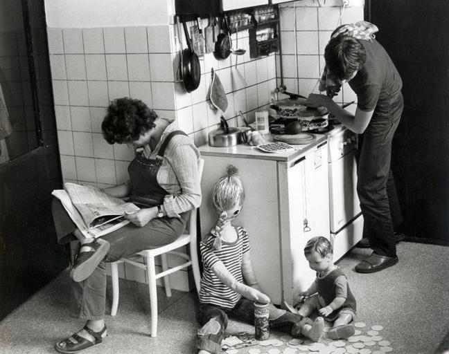 | Keywords: haarlem nederland feminism domesticity dolls simulation stove newspaper overalls reading kitchen womensday tuinbroek reading newspaper readingnewspaper cooking father cookingfather reading mother readingmother sandals food preparation foodpreparation pannelap home family indoor Spaarnestad Photo, SFA003007238 Feminisme, emancipatie, veranderende rolpatronen in het gezin. Moeder leest de krant, vader kookt, terwijl de "kinderen" (poppen) spelen. Haarlem, Nederland.1982. Feminism, emancipation. Changing family role patterns: mom reads newspaper while dad prepares diner and kids play. The Netherlands, Haarlem, 1982. Spaarnestad Photo, SFA003007238 Feminisme, emancipatie, veranderende rolpatronen in het gezin. Moeder leest de krant, vader kookt, terwijl de "kinderen" (poppen) spelen. Haarlem, Nederland.1982. Feminism, emancipation. Changing family role patterns: mom reads newspaper while dad prepares diner and kids play. The Netherlands, Haarlem, 1982. |