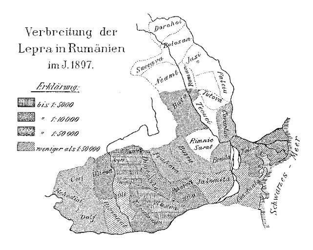| Keywords: Verbreitung der Lepra in Rumänien im J.1897.JPG en Map of the Romanian Kingdom showing leprosy distribution per county as recorded in 1897 Lepra in Rumänien Berlin 1904 available through the Bucharest City Library http //digitool dc bmms ro 8881/R/3YEN91RDQHN2LLAT98CMIIVH6GP3F19S45D2I6YYIM6AN3KQEN-00734 func search DacoRomanica archive Victor Babeş 1904 Victor Babeș Maps of the Kingdom of Romania Demographic maps of Romania Disease incidence maps of Romania Leprosy in Romania 1897 in Romania 1897 in medicine 1904 maps Maps in German PD-old |