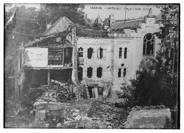 | Keywords: Verdun - Laurent printing shop (LOC) (26283585126).jpg Bain News Service publisher Verdun - Laurent printing shop between ca 1915 and ca 1920 1 negative glass ; 5 x 7 in or smaller Notes Title from data provided by the Bain News Service on the negative Forms part of George Grantham Bain Collection Library of Congress Format Glass negatives Rights Info No known restrictions on publication Repository Library of Congress Prints and Photographs Division Washington D C 20540 USA http //hdl loc gov/loc pnp/pp print hdl loc gov/loc pnp/pp print General information about the Bain Collection is available at http //hdl loc gov/loc pnp/pp ggbain hdl loc gov/loc pnp/pp ggbain Higher resolution image is available Persistent URL http //hdl loc gov/loc pnp/ggbain 26566 hdl loc gov/loc pnp/ggbain 26566 Call Number LC-B2- 4545-4 https //www flickr com/photos/library_of_congress/26283585126/ Verdun - Laurent printing shop LOC LOC-image ggbain 26566 https //www flickr com/people/8623220 N02 The Library of Congress http //www loc gov/rr/print/195_copr html noknown The Library of Congress Flickr Commons PD-Bain The Library of Congress https //flickr com/photos/8623220 N02/26283585126 2016-09-08 05 54 10 pd History of Verdun |