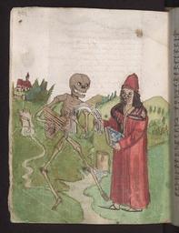 | Keywords: Vergänglichkeitsbuch 216 103v Totentanz.jpg Seite aus dem so genannten Zimmerischen Totentanz im Vergänglichkeitsbuch des Wilhelm Werner von Zimmern Württembergische Landesbibliothek Cod Don A III 54 fol 103v Der Meister von Paris http //digital wlb-stuttgart de/purl/bsz352890320 between 1540 1550 Wilhelm Werner von Zimmern PD-old-100 Vergänglichkeitsbuch Cod Don A III 54 Zimmerischer Totentanz Danse Macabre Scholars Educators in art Males with books in art | ||||