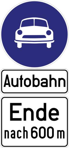 | Keywords: Verkehrszeichen-Kombination (Bild 17c mit Zusatzzeichen) - Autobahnende nach 600 Metern, vor 1971.svg de Verkehrszeichen-Kombination Bild 17c mit Zusatzzeichen Autobahnende nach 600 Metern Das Vorbild für dieses Schild ist in einem žTelekurs für Autofahrer des Bayerischen Rundfunks von 1968/1969 sehr deutlich zu sehen und wurde von mir über einem Standfoto nachgezeichnet Für das Blau wurde damals das RAL-Farbtonregister 840 R gewählt Der dort verzeichnete Ton ist in der Abbildung wiedergegeben Zeichen dieser Art wurden bis 1971 aufgestellt own Mediatus 2013-10-18 + Signs User Mediatus/no-new-version Cc-zero PD-VzKat SVG road signs in Germany Diagrams of motorway road signs of Germany 1956 set |