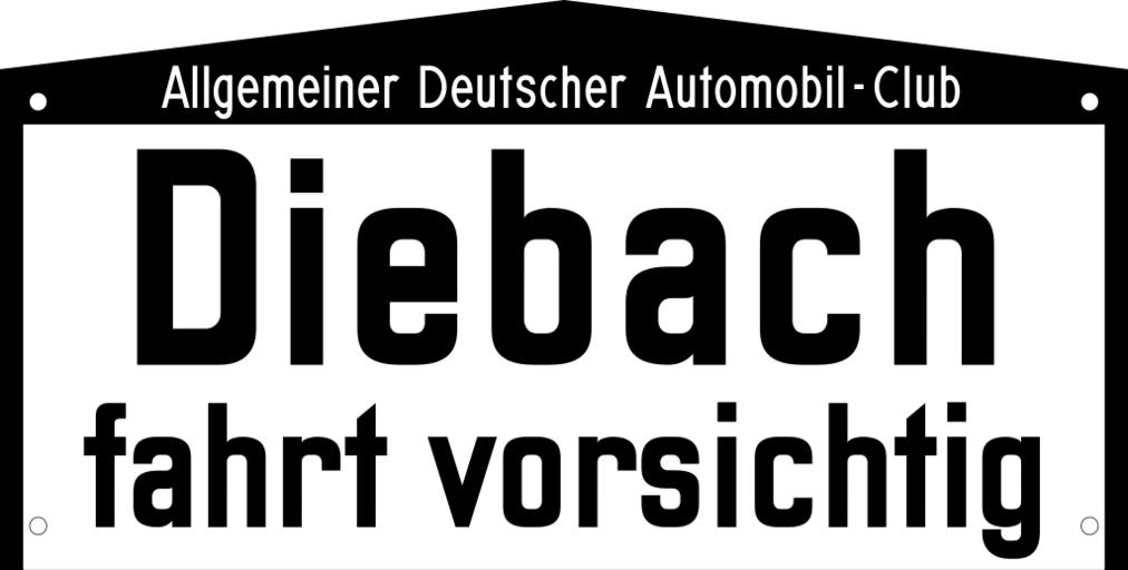 | Keywords: Verkehrszeichen - Ortstafel Diebach - fahrt vorsichtig, ADAC.svg de Deutsches Verkehrszeichen Ortstafel Diebach - fahrt vorsichtig Ein vom ADAC bei einer Berliner Emaillierfabrik in Auftrag gegebenes Ortsschild Solche Ortstafeln stellten der ADAC in Eigenregie von 1912 bis 1934 auf Diese Tafel ist ein sehr frühes Beispiel Nachdem die Länderverordnungen spätestens nach dem Ende des ersten Weltkriegs keine Fortsetzung mehr fanden wurde die Aufstellung von Ortstafeln erst mit Einführung der Reichs-Straßenverkehrs-Ordnung ab dem 1 Oktober 1934 wieder eine Aufgabe des Staates https //web archive org/web/20160708153607/http //nummernschildmuseum de/adac/ Selbst gezeichnet und interpretiert durch Mediatus Mediatus 2016-07-08 other fields + Signs User Mediatus/no-new-version Cc-zero PD-VzKat German language signs SVG road signs in Germany Black and white signs Diagrams of information road signs of Germany ADAC road signs Diebach |