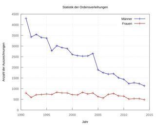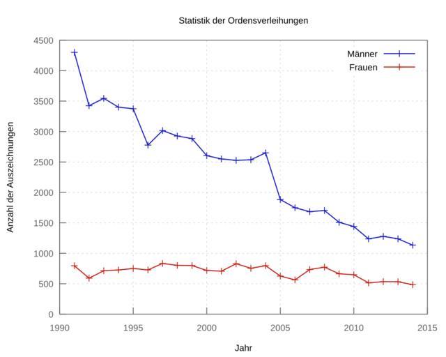 Keywords: Verleihungsstatistik Verdienstorden Deutschland.svg en Number of recivers of the Order of Merit of the Federal Republic of Germany by time and sex de Anzahl der Bundesverdienstordensverleihungen nach Jahr und Geschlecht own Michael F Schönitzer Stade 2014-05-20 Datasource http //www bundespraesident de/DE/Amt-und-Aufgaben/Orden-und-Ehrungen/Verdienstorden/Statistik/statistik-der-ordensverleihungen-node html bundespraesident de https //web archive org/web/20111004153050/http //www bundespraesident de/DE/Amt-und-Aufgaben/Orden-und-Ehrungen/Verdienstorden/Statistik/statistik-der-ordensverleihungen-node html Webarchive-copy of bundespraesident de Datafile <pre> 1991 4301 795 5096 15 6 1992 3425 591 4016 14 7 1993 3546 714 4260 16 8 1994 3400 726 4126 17 6 1995 3375 750 4125 18 2 1996 2777 727 3504 20 7 1997 3015 833 3848 21 6 1998 2926 801 3727 21 5 1999 2885 799 3684 21 7 2000 2604 718 3322 21 6 2001 2550 706 3256 21 7 2002 2527 829 3356 24 7 2003 2536 754 3290 22 9 2004 2650 797 3447 23 1 2005 1883 625 2508 24 9 2006 1749 563 2312 24 4 2007 1684 733 2417 30 3 2008 1703 772 2475 31 2 2009 1509 664 2173 30 5 2010 1439 647 2086 31 0 2011 1237 515 1752 29 3 2012 1278 534 1812 29 4 2013 1238 533 1770 30 1 2014 1134 484 1617 29 9 </pre> Michael F Schönitzer v Prettyer red and slightly thicker line set style line 1 lc rgb ' c51a0e' pt 1 ps 1 lt 1 lw 1 3 set style line 2 lc rgb ' 1414C5' pt 1 ps 1 lt 1 lw 1 3 make axis grey and two sides only set style line 11 lc rgb ' 606060' lt 1 set border 31 back ls 11 set tics nomirror add light grid set style line 12 lc rgb ' 909090' lt 0 lw 0 3 set grid back ls 12 set xlabel Jahr set ylabel Anzahl der Auszeichnungen set title Statistik der Ordensverleihungen set xrange 1990 2014 set yrange 0 set terminal svg set output 'Verleihungsstatistik Verdienstorden Deutschland svg' plot 'BundesVerdienstorden' u 1 2 w lp t Männer 'BundesVerdienstorden' u 1 3 w lp t Frauen unset output Cc-zero Work by Michael Schönitzer Order of Merit of the Federal Republic of Germany |