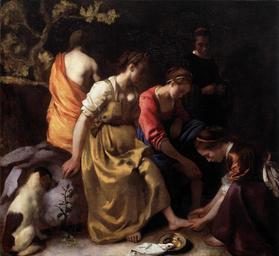 | Keywords: Vermeer - Diana en haar nimfen.jpg Artwork Q32234 Creator Jan Vermeer van Delft Diana and her Companions Diana en haar gezelschap http //www rkd nl/rkddb RKD images Kunstwerknummer 14506 Diana und ihre Gefährtinnen Alternate titles Diana and her nymphs ± 1653-1654 1647-1675 Oil on canvas cm 97 8 104 6 Institution Mauritshuis accession number Inv no 406 object history Provenance 1876 bought by the Mauritshuis The Hague as a work by Nicolaes Maes credit line bottom left Langswitch Traces of signature and date Reste von Signatur und Datum Resten van signatuur en datum source 180px PD-old-100 Diana and her companions by Johannes Vermeer |