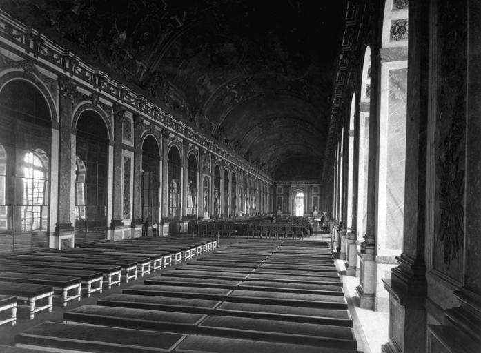 Keywords: versailles france 1918 treaty world war i arrangement tables chairs black and white history architecture historical landmark