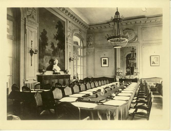 | Keywords: peace versailles treaty monochrome indoor Local Accession Number: 853 Description: Conference table at the peace conference. Photographer: Unknown Source: Unknown Size: 6x9 Medium: Print, Black and White Date: 1919? Local Accession Number: 853 Description: Conference table at the peace conference. Photographer: Unknown Source: Unknown Size: 6x9 Medium: Print, Black and White Date: 1919? | ||||