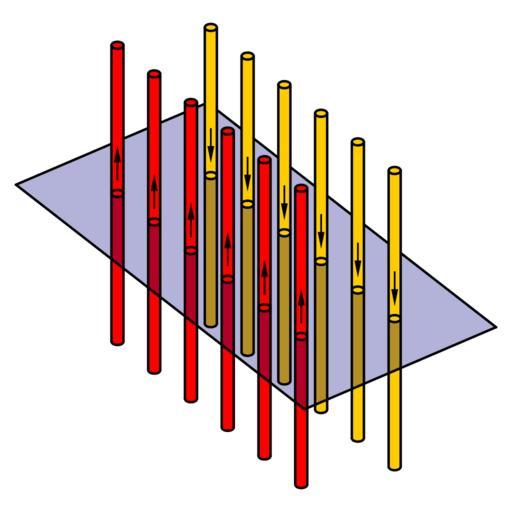 | Keywords: Vertical Wire Array.svg A diagram of 12 staggered parallel wires that carry current through a plane blue All the wires on one side red carry current upwards red all the ones of the other side carry current downwards yellow self-made Inkscape 09/11/2007 Inductiveload Magnetism |