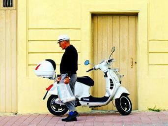 | Keywords: vespa scooter man walking motorcycle transport urban vehicle retro transportation street adult moped riding style motorbike people outdoors person classic cool bike lifestyle hat fashion male gentleman shopping shopping bag groceries mediterranean malta vespa scooter daily life village town wooden door parked 2 wheels white black |