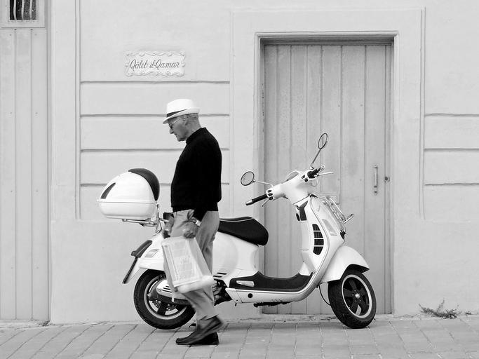 | Keywords: vespa scooter man walking motorcycle transport urban vehicle retro transportation street adult moped riding style motorbike people outdoors person classic cool bike lifestyle hat fashion male gentleman shopping shopping bag groceries mediterranean malta vespa scooter daily life village town wooden door parked 2 wheels white black |