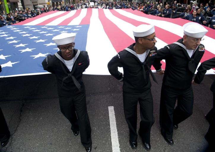 MAKE A MEME View Large Image Veterans Day parade 151111-N-OT964-982.jpg en 151111-N-OT964-982 NEW YORK Nov 11 2015 Sailors hold the national ensign as they march during the NYC Veterans Day parade U S Navy photo by Mass Communication Specialist 1st Class Martin L ...