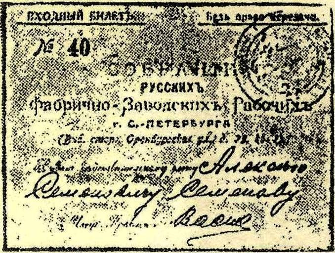 Keywords: Vhodnoy bilet.jpg ru Входной билет члена Соб ания усских фаб ично-заводских абочих Санкт-Пете бу га А С Семёнова Газета Т уд от 22 янва я 1927 года ет 1904 год Bloody Sunday 1905 PD-old