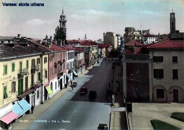 Keywords: A destra Palazzo Estense (arch. Giuseppe Antonio Bianchi, 1766-73). In fondo, in via Marcobi presenta l'angolo di via Veratti con la cortina delle vecchie case in attesa dell'imminente abbattimento. varese palazzoestense