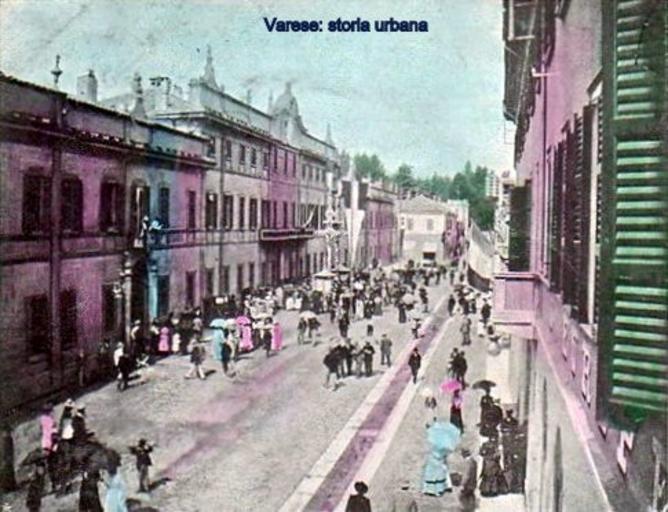 Keywords: Versione colorata. A sinistra Palazzo Estense (arch. Giuseppe Antonio Bianchi, 1766-73), segue la filanda costruita nel 1837 e abbattuta nel 1932. Sul fondo si intravede il parco di villa Baroggi con l'imponente portineria (ing. Giacomo Cova, 1890) ora scomparsa. A destra uno scorcio della casa dell'albergo Europa (1855). varese palazzoestense |