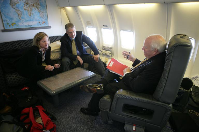 View Original:Vice_President_Cheney_Talks_with_David_Addington_and_Lea_Anne_McBride_Aboard_Air_Force_Two_En_Route_to_Colorado.jpg (4992x3328)