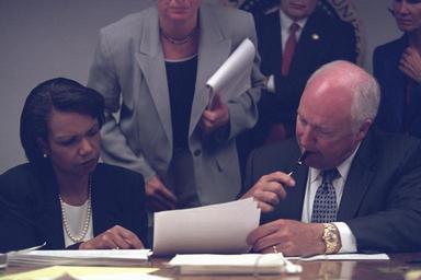 View Original:Vice_President_Cheney_with_National_Security_Advisor_Condoleezza_Rice_in_the_President's_Emergency_Operations_Center_(PEOC).jpg (3072x2048)