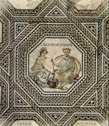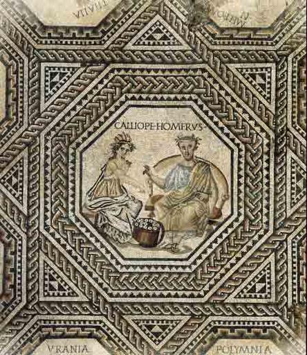 Keywords: Victen Roman muse mosaic.jpg Vichten Luxembourg It shows Calliope the muse of epic poetry with the poet Homer http //www mnha public lu/collections/epoque_galloromaine/paix_romaine/mosaique_muses/index html Unknown ancient Roman artist ca 240 AD PD-old-100 Replica of the Ancient Roman mosaic in Vichten Calliope Homer on mosaics |