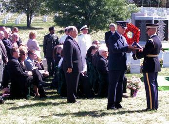 Keywords: Victims of the Terrorist Attack on the Pentagon Memorial - Gen Myers receives flag - Arlington National Cemetery - 2002-09-12.jpg en Captain Joseph Jancysk of the Army's 3rd Infantry Regiment The Old Guard presents the American flag to Air Force General Richard B Myers chairman of the Joint Chiefs of Staff during the funeral at Arlington National Cemetery in Arlington Virginia U S on September 12 2002 The funeral was for those five individuals for whom no remains could be identified after the attack The remains of 25 others the majority of whose remains had been identified and buried months earlier; additional remains had been found however were cremated interred in an urn the urn placed in a casket and the casket interred beneath the Victims of Terrorist Attack on the Pentagon Memorial The Victims of Terrorist Attack on the Pentagon Memorial black cube-like object can be seen in the rearground along with a red carnation floral display in the form of a pentagon http //osd dtic mil/news/Sep2002/200209124k_hr jpg American Forces Press Service U S Department of Defense Rudi Williams photographer 2002-09-12 PD-USGov Victims of Terrorist Attack on the Pentagon Memorial First anniversary of the September 11 2001 attacks |
