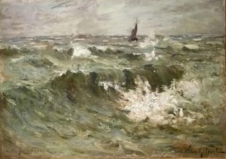| Keywords: Victor Gilsoul 001.JPG en Turbulent weather on the North Sea oil on canvas 38 x 52 cm by the Belgian painter Victor Gilsoul 1867-1939 ; private collection 2012-12-29 17 52 51 own JoJan PD-old-70 Photo made at an art exhibition in Knokke-Heist Belgium in 2012 cc-by-3 0 Uploaded with UploadWizard Victor Gilsoul |