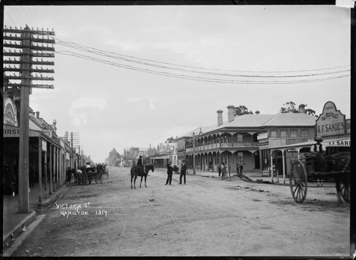 Keywords: blackandwhite monochrome outdoor road photo border architecture black and white View of Victoria Street, Hamilton. Photograph taken by William A Price. Dated from the existence of various businesses in Victoria Street in 1908 (See Wise's Post Office Directory 1908). Business signs for R F Sandes (Chemist), Langley Shaw (stock & station agents), and the Peerless Printing Works are all visible, and centre right is the Hamilton Hotel. There are a number of people in the street, including several in carriages, and one man riding a horse. Inscriptions: Inscribed - Photographer's title on negative -bottom left: Victoria St. Hamilton. 1317. Quantity: 1 b&w original negative(s). Physical Description: Dry plate glass negative 6.5 x 4.5 inches Victoria Street, Hamilton. Price, William Archer, 1866-1948 :Collection of post card negatives. Ref: 1/2-001326-G. Alexander Turnbull Library, Wellington, New Zealand. natlib.govt.nz/records/23075839 View of Victoria Street, Hamilton. Photograph taken by William A Price. Dated from the existence of various businesses in Victoria Street in 1908 (See Wise's Post Office Directory 1908). Business signs for R F Sandes (Chemist), Langley Shaw (stock & station agents), and the Peerless Printing Works are all visible, and centre right is the Hamilton Hotel. There are a number of people in the street, including several in carriages, and one man riding a horse. Inscriptions: Inscribed - Photographer's title on negative -bottom left: Victoria St. Hamilton. 1317. Quantity: 1 b&w original negative(s). Physical Description: Dry plate glass negative 6.5 x 4.5 inches Victoria Street, Hamilton. Price, William Archer, 1866-1948 :Collection of post card negatives. Ref: 1/2-001326-G. Alexander Turnbull Library, Wellington, New Zealand. natlib.govt.nz/records/23075839 |