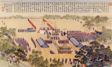 | Keywords: Victorious Return.jpg en The triumphal return of the Chinese Army from the Jinchuan Campaign 1771-1776 zh-hans 平定两金 ,郊台迎劳將军阿桂凯旋 http //www battle-of-qurman com cn/e/hist htm late XVIII century A collaboration between Chinese and European painters The Jesuit missionaries involved in producing the drawings in China were Giuseppe Castiglione Jean-Denis Attiret Ignace Sichelbart and Jean Damascene The engravings were executed in Paris under the direction of Charles-Nicolas Cochin of the Académie Royal at the Court of Louis XVI and the individual engravers include Le Bas Aliamet Prevot Saint-Aubin Masquelier Choffard and Launay PD-Art Military of Qing China Ten Great Campaigns Paintings of the Qing Dynasty Qianlong Emperor |