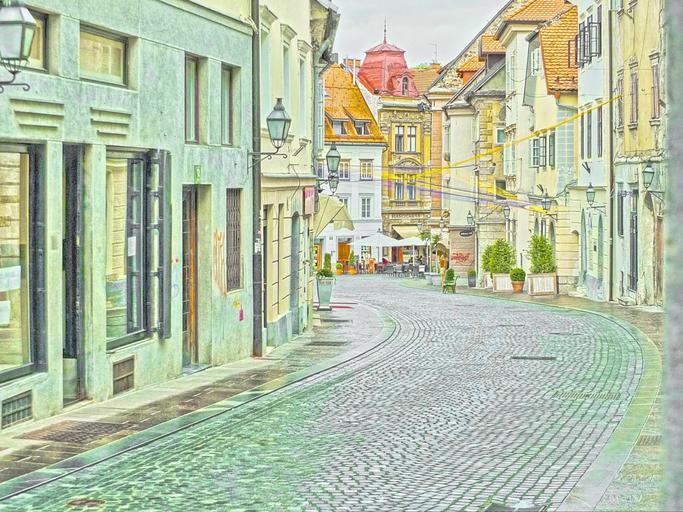 | Keywords: VidGajsek - WAY US838.jpg en wet Upper Square traditional old catholic district of Ljubljana City Capital of Slovenia in Europe own Vid Gajšek 2012 Eleassar <sup> t/p </sup> 10 11 7 December 2012 UTC Upper Square Ljubljana Sett-paved streets in Ljubljana |