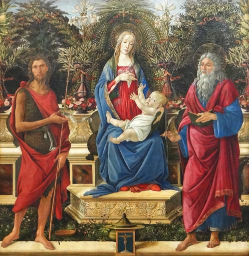 | Keywords: Vierge avec Saints (Gemäldegalerie, Berlin) (11328146525).jpg Artwork Q3210257 Creator Sandro Botticelli title Madonna mit Kind und den beiden Johannes Madonna and Child with both Saints John Vierge avec Saints la Madone Bardi Madonna con bambino e i due Santi Giovanni <br> Alternate title fr La Vierge est représentée avec l'enfant Jésus sur un trône elle s'apprête à lui donner le sein Elle est entourée de Saint Jean Baptiste à gauche qui semble s'adresser aux fidèles et de Saint Jean l'Evangéliste à droite avec ses attributs traditionnels le Livre et la Plume La composition d'ensemble et le paysage devant lequel les personnages sont représentés font l'originalité et la beauté de ce tableau Les symboles iconographiques y sont très nombreux le jardin clos les lys blancs les vases les fleurs rouges les palmes Ils évoquent la pureté de Marie la future Passion du Christ et traduisent le rôle et la place de la Vierge dans la mystique chrétienne 1485 Oil poplar cm 185 180 Institution Gemäldegalerie Berlin XVIII http //www smb-digital de/eMuseumPlus service ExternalInterface module collection objectId 864025 viewType detailView Gemäldegalerie Berlin<br> 02554348 <br> oQGX0kbVHnZ-lA object history Bardi Chapel Santo Spirito Florence ; ProvenanceEvent 1829 acquisition credit line exhibition history The Botticelli Renaissance Inschrift ECCE AGNVS DEI QVI TOLLIS PECHATA M VNDI Anbringungsort auf dem Spruchband des Täufers<br> Inschrift QVASI PLANTATIO ROS A E IN HI ERICHO Anbringungsort an den Rosen<br> Inschrift SICVT LILIVM IN CAMPIS Anbringungsort an den Lilien<br> Inschrift QVASI CYPRESSVS IN MONTE SION; QVASI PALMA EXALTATA SVM IN CADES; QVASI PLATANVS EXALTATA SVM IVXTA AQVAM IN PLATEIS Anbringungsort an den Bäumen<br> fr Ce tableau d'autel a été commandé à Botticelli par un négociant florentin appelé Giovanni d'Agnolo de Bardi pour sa chapelle funéraire accession number 106 https //www flickr com/photos/dalbera/11328146525/ Vierge avec Saints Gemäldegalerie Berlin https //www flickr com/people/72746018 N00 Jean-Pierre Dalbéra from Paris France 52 508661 13 364587 source Flickr dalbera http //flickr com/photos/72746018 N00/11328146525 2014-12-09 17 33 32 cc-by-2 0 PD-old-100-1923 cc-by-2 0 DEFAULTSORT Botticelli Madonna and Child with both Saints John Madonna Bardi by Sandro Botticelli 04 |