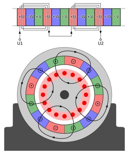 | Keywords: Vierpolig-3stränge.svg de Das Bild zeigt die Wicklung einer 4-poligen Asynchronmotor mit 3 Strängen Oben in Abwicklung und am Motor Besonders zu beachten ist das Wicklung W entgegengesetzt gepolt wird doch der Wicklungssinn den anderen Polen des Motors gleicht Die Reihenfolge der Pole ist somit nicht +U+V+W sondern +U-W+V Die Phase zur Folgewicklung beträgt somit 60° <br /> Des Weiteren sind exemplarisch die Magnetfeldlinien für die U-Wicklung eingezeichnet Hierbei erkennt man die vier magnetischen Pole die der Stator zum Rotor hin bildet In der Diagonalen von links oben nach rechts unten zwei Südpole und in der Diagonalen von rechts oben nach links unten zwei Nordpole<br /> Bei anlegen eines Drehstromes mit Rechtsdrehfeld läuft der Rotor im Uhrzeigersinn Own Created with Inkscape BurnsBurnsBurns SVG electric motors |