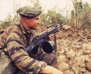 Keywords: Vietnam p05.jpg A U S Navy SEAL in Vietnam keeps his Stoner 63A light machine gun at the ready while the rest of his squad prepares demolition charges on a Vietcong bunker Navy/National Archives 1968-03-26 Unknown PD-USGov Original upload log en wikipedia Magnus Manske CommonsHelper page en wikipedia Vietnam_p05 jpg 2009-04-21 20 51 Koalorka 500×407× 82319 bytes <nowiki> A U S Navy SEAL in Vietnam with the Stoner 63A LMG Navy/National Archives N/A Unknown </nowiki> Stoner 63 LMG Stoner 63 rifle United States Navy SEALs United States Navy in the Vietnam War Tigerstripe camouflage |