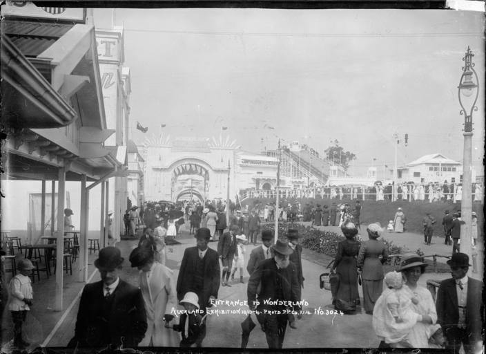 Keywords: blackandwhite monochrome people crowd black and white View taken looking towards the entrance way (a man with his mouth wide open), with the pool and water chute on the righthand side. People are in the foreground walking to and from Wonderland. People can be seen on the righthand side looking at the activity in the pool area and up at the top of the water chute where the ride starts. Photograph taken by William Archer Price (Price Photographic Company), 1 Jan 1914 at the Auckland Exhibition, Auckland Domain. Inscriptions: Inscribed - Photographer's title on negative -bottom centre: Entrance to Wonderland. Auckland Exhibition 1913-4. Protd P.P.Co. 1.1.14. No 3024. Quantity: 1 b&w original negative(s). Physical Description: Dry plate glass negative 4.5 x 6.5 inches View of the entrance to Wonderland, Auckland Exhibition, Auckland Domain. Price, William Archer, 1866-1948 :Collection of post card negatives. Ref: 1/2-001115-G. Alexander Turnbull Library, Wellington, New Zealand. natlib.govt.nz/records/22418985 View taken looking towards the entrance way (a man with his mouth wide open), with the pool and water chute on the righthand side. People are in the foreground walking to and from Wonderland. People can be seen on the righthand side looking at the activity in the pool area and up at the top of the water chute where the ride starts. Photograph taken by William Archer Price (Price Photographic Company), 1 Jan 1914 at the Auckland Exhibition, Auckland Domain. Inscriptions: Inscribed - Photographer's title on negative -bottom centre: Entrance to Wonderland. Auckland Exhibition 1913-4. Protd P.P.Co. 1.1.14. No 3024. Quantity: 1 b&w original negative(s). Physical Description: Dry plate glass negative 4.5 x 6.5 inches View of the entrance to Wonderland, Auckland Exhibition, Auckland Domain. Price, William Archer, 1866-1948 :Collection of post card negatives. Ref: 1/2-001115-G. Alexander Turnbull Library, Wellington, New Zealand. natlib.govt.nz/records/22418985 |