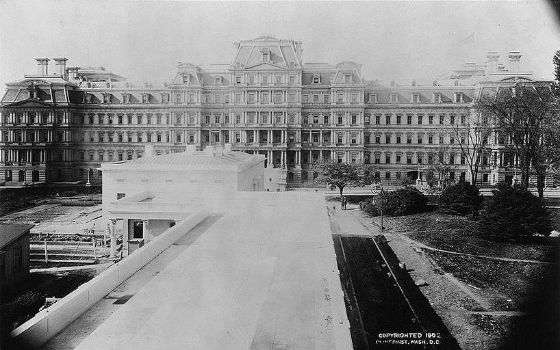 Keywords: View from White House window showing new Executive Office 1902 cropped.jpg en View from White House window showing Grand Esplanade and new Executive Office cropped Library of Congress http //www loc gov/pictures/item/2002706945 Barnett McFee Clinedinst 1902 PD-Old West Wing PD-US Views from windows |