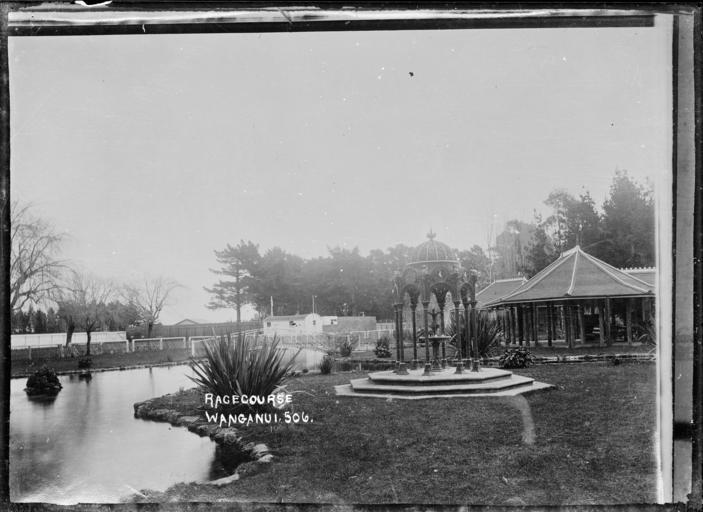 Keywords: blackandwhite monochrome photo border outdoor black and white View of the Freeman R Jackson Memorial fountain with a lake on the left and pavilions on the right. Photograph taken by William Archer Price. Inscriptions: Inscribed - Photographer's title on negative -bottom left: Racecourse. Wanganui [No.] 506. Quantity: 1 b&w original negative(s). Physical Description: Dry plate glass negative View of the gardens behind the grandstand at the Wanganui Racecourse, including the Freeman R Jackson memorial. Price, William Archer, 1866-1948 :Collection of post card negatives. Ref: 1/2-001064-G. Alexander Turnbull Library, Wellington, New Zealand. natlib.govt.nz/records/22793436 View of the Freeman R Jackson Memorial fountain with a lake on the left and pavilions on the right. Photograph taken by William Archer Price. Inscriptions: Inscribed - Photographer's title on negative -bottom left: Racecourse. Wanganui [No.] 506. Quantity: 1 b&w original negative(s). Physical Description: Dry plate glass negative View of the gardens behind the grandstand at the Wanganui Racecourse, including the Freeman R Jackson memorial. Price, William Archer, 1866-1948 :Collection of post card negatives. Ref: 1/2-001064-G. Alexander Turnbull Library, Wellington, New Zealand. natlib.govt.nz/records/22793436