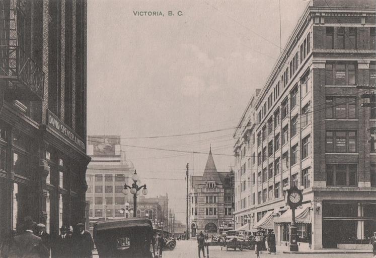 Keywords: building architecture outdoor monochrome "Victoria, B. C." Private Post Card. European Import Company, Vancouver, B. C. Serie Photo-print No. 224. View looking west down View Street from the 600-block towards the intersection at Broad Street in Victoria, BC on Vancouver Island. The building on the far left is David Spencer's department store on the SE corner which was originally the Driard Hotel. "Victoria, B. C." Private Post Card. European Import Company, Vancouver, B. C. Serie Photo-print No. 224. View looking west down View Street from the 600-block towards the intersection at Broad Street in Victoria, BC on Vancouver Island. The building on the far left is David Spencer's department store on the SE corner which was originally the Driard Hotel. |