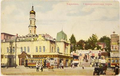 | Keywords: View to University Hill in Kharkov.jpg View to University Hill in Kharkov Russian Empire Postcard ru Вид Униве ситетской го ки в Ха ькове с то ца улицы Екате инославской че ез заст оенную Се гиевскую площадь Слева здание музея A reproduction of post cards dated early 20th century scan for original paper postcard // еп одукция почтовой ка точки начала XX века скан бумажной отк ытки 1908-1917 Russian Empire Post; на отк ытке не указан PD-old PD-RusEmpire Postcards of Kharkiv Trams in Kharkiv Uspensky Cathedral in Kharkiv University Hill in Kharkiv |