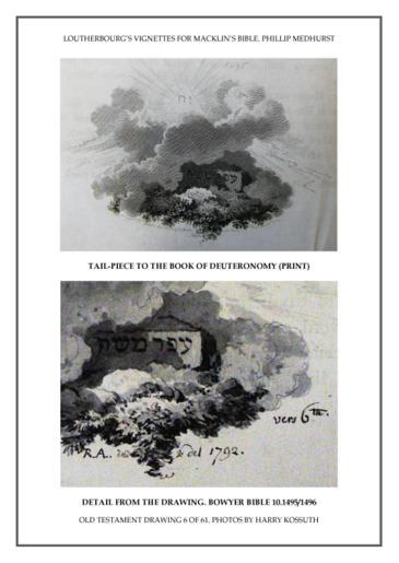 | Keywords: Vignette by Loutherbourg for the Macklin Bible 6 of 134. Bowyer Bible Old Testament. Tailpiece to Deuteronomy.gif  en Tail-piece to Deuteronomy Deuteronomy cap 34 v 6 And he Joshua buried him Moses in a valley in the land of Moab over against Beth-peor but no man knoweth of his sepulchre unto this day Vignette with clouds over a stone with inscription on foliage being the tomb of Moses a glowing triangle symbol representing God in the sky above; letterpress in two columns above and on verso The glory of God represented as a cloud obscures the last resting place of Moses whose place of burial is unknown 1792 Inscriptions Lettered below image with production detail P J de Loutherbourg del J Landseer Aq Forti Fec and publication line Published Septr 25 1792 by T Macklin London Print made by John Landseer Dimensions height 480 millimetres; width 384 millimetres Photos by Harry Kossuth Phillip Medhurst 1792-09-25 PD-old-100 Book of Deuteronomy Vignettes by Loutherbourg for the Macklin Bible Vignette Drawings by Loutherbourg in the Bowyer Bible Art depicting the Old Testament by Philippe De Loutherbourg John Landseer |