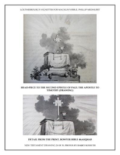 | Keywords: Vignette by Loutherbourg for the Macklin Bible 112 of 134. Bowyer Bible New Testament. Headpiece to 2 Timothy.gif  en Head-piece to the second epistle of Paul the apostle to Timothy vignette with an altar and incense burner 2 Timothy 3 5 ; letterpress in two columns below and on verso 1800 Inscriptions Lettered below image with production detail P J de Loutherbourg del J Heath direx and publication line Pubd by T Macklin Fleet Street London Print made by James Heath Dimensions height 490 millimetres sheet ; width 390 millimetres sheet Photos by Harry Kossuth Phillip Medhurst 1800-01-01 PD-old-100 Second Epistle to Timothy Vignettes by Loutherbourg for the Macklin Bible Vignette Drawings by Loutherbourg in the Bowyer Bible Art depicting the New Testament by Philippe De Loutherbourg |