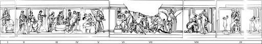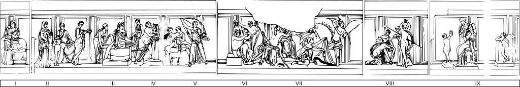 | Keywords: Villa dei Misteri - Sala del Grande Dipinto - Scene Sequence.svg  Le religioni misteriche nell'antichità greco-romana erano delle sette religiose che promettevano ai loro aderenti di interrompere prima del tempo il ciclo di reincarnazioni in nuovi corpi al quale tutti gli esseri umani erano condannati nelle loro vite terrene al fine di liberarsi dall'elemento titanico materiale e malvagio di cui sono formati e di ritornare prima della fine del ciclo universale di 12 000 anni fra gli dei dei quali essi fanno parte grazie all'altro elemento che li compone quello divino la parte spirituale e buona dell'essere umano Sulle pareti del triclinio della Villa dei Misteri a Pompei è rappresentato caso unico in tutto il mondo antico il rito di iniziazione di una giovane donna ai misteri orfico-dionisiaci rito che - dopo un lungo periodo di formazione - le permetteva di entrare a pieno titolo a far parte della comunità e soprattutto dopo la sua morte di essere accolta nell'Olimpo fra gli altri dei anziché di tornare nell'Ade fra le anime dei comuni mortali che presso il fiume infernale Lete dovevano attendere mille anni prima di reincarnarsi in un nuovo corpo e ritornare a vivere sulla Terra Nel ciclo pittorico affrescato si riconoscono in nove quadri i sette momenti principali del rito di iniziazione 1 IX la VESTIZIONE dell'inizianda per le nozze mistiche col dio; 2 II la CATECHESI o lettura del rituale; 3 III l'AGAPE fraterna; 4 IV la COMUNIONE col dio; 5 V-VI l'ANNUNCIAZIONE di morte; 6 VII la beatitudine divina Dioniso ed Arianna ; 7 VII-VIII la PASSIONE; 8 VIII la RESURREZIONE; 9 I la domina-sacerdotessa che assiste con attento distacco a tutto lo svolgimento del rito en Scene sequence of frecoes in the Sala del Grande Dipinto in the Villa dei Misteri in Pompeii de Szenefolge der Fresken im Sala del Grande Dipinto in der Villa dei Misteri in Pompeij Own WolfgangRieger Frescos of the mystery ritual 09 |