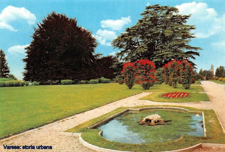 Keywords: I giardini di villa Mirabello. A destra il secolare cedro del Libano. Sul fondo il campanile della chiesa di San Vittore a Casbeno. varese casbeno