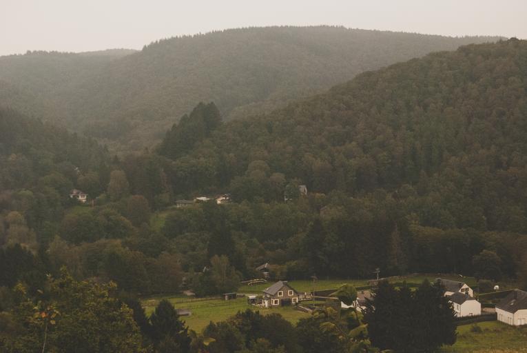Keywords: village mountains landscape nature rural hill countryside green cloud scenic forest valley houses meadows trees misty foggy hazy grey autumnal wet hillside