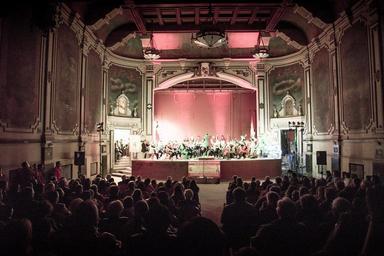 | Keywords: hall auditorium La ex sala del teatro Cervantes de Punta Arenas fue el lugar escogido para presentar el repertorio de Villancicos que prepararon los músicos de la Orquesta de Cuerdas del Conservatorio de Música de la Universidad de Magallanes junto al Coro Cantares de España, en el contexto de las celebraciones navideñas, bajo la dirección del maestro Ricardo Colima. La ex sala del teatro Cervantes de Punta Arenas fue el lugar escogido para presentar el repertorio de Villancicos que prepararon los músicos de la Orquesta de Cuerdas del Conservatorio de Música de la Universidad de Magallanes junto al Coro Cantares de España, en el contexto de las celebraciones navideñas, bajo la dirección del maestro Ricardo Colima. |