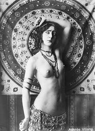 | Keywords: VillanyCircleBackgroundElbowUpBain.jpg Dancer Adorée Villany half-length photoportrait standing in front of circular design print topless with necklace elbow above her head Bain News service photo via Library of Congress site http //hdl loc gov/loc pnp/ggbain 12379 Not dated Probably 1910s Unnamed photographer for Bain News Service PD-Bain Adorée Villany Vintage nude photographs Topless women with necklaces in cleavage Nude or partially nude women facing right and looking left Black and white photographs of topless women |