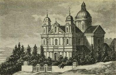 Keywords: Vilnia, Antokal. Вільня, Антокаль (1911).jpg Вільня Vilnia Антокаль Antokal Касьцёл Сьвятых Апосталаў Пят а і Паўла Historye cudownych obrazów Najświętszej Maryi Panny w Polsceю T 4 Kraków 1911 author 1911 PD-old-70 Exterior of St Peter and St Paul's Church in Vilnius Antakalnis in art