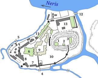 | Keywords: VilniusCastle.svg  Aukštutinė pilis 1 vakarinis bokštas; 2 pietinis bokštas išlikę pamatai ; 3 rūmai likę griuvėsiai Žemutinė pilis 4 vartai ir tiltas į miestą Pilies gatvę ; 5 kelias ir tiltas į Tilto gatvę; 6 arkikatedra; 7 Vyriausiojo tribunolo rūmai; 8 Vyskupų rūmai; 9 Valdovų rūmai; 10 rūmų sodas; 11 rūmų pastatas nuo XVIII a pab arsenalas dabar muziejus; 12 šiaurės rytų bokštas ir arsenalo vartai; 13 arsenalo kiemas 2005-12-28 own assumed Knutux History of Vilnius Maps of Vilnius Plans of Vilnius Castle |