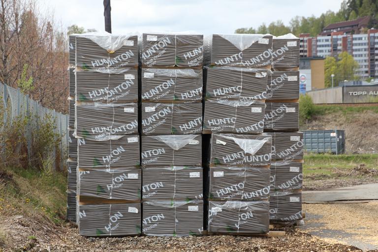 Keywords: Vindtettplater.JPG no Vindtettplater fra Hunton 2012-05-18 own Øyvind Holmstad cc-zero Uploaded with UploadWizard Piles Hunton Fiber Wooden boards