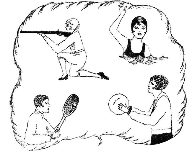 Keywords: vintage old old fashioned antique black black and white sketch drawing victorian retro people women female sport games recreation leisure active activities players shooting rifle swimming netball tennis play training action athlete competition young |