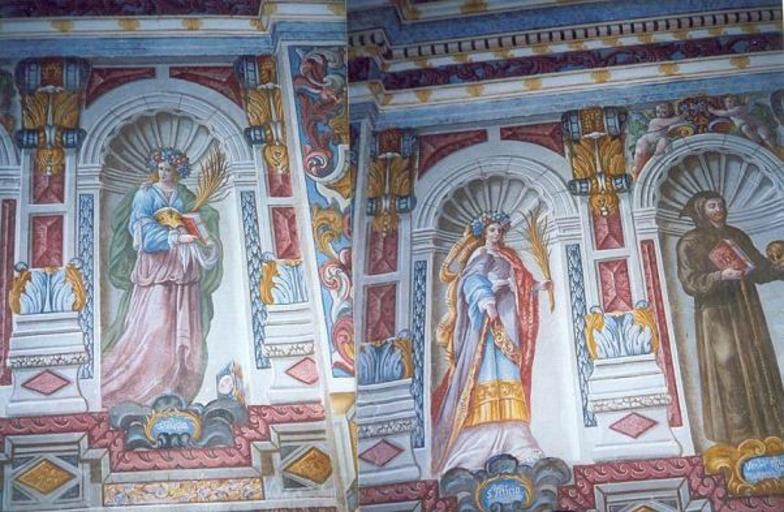 Keywords: Virgen de Casbas (frescos). Ayerbe.jpg Artwork es Virgen de Casbas es frescos En la ermita de Nuestra Señora de Casbas la decoración pictórica de autor desconocido es toda de una mano y ofrece un programa iconográfico completo Se extiende por muros lunetos y arcos e incluye abundantes motivos de ornamentación barroca realizados con buen dibujo que denota precisión y soltura El colorido es el característico del momento primera mitad del Siglo XVIII a base de colores primarios sin gran variedad de tonos intermedios que amortigüen los contrastes Enmarcadas en hornacinas aveneradas pintadas aparecen reproducidas las siguientes imágenes que en el muro del evangelio comenzando desde la capilla mayor son San Lucas San Mateo San Pedro San Pablo San José Santa Elena San Valero San Felipe Neri San Antonio Abad y el niño San Quilez o Quirico En el muro opuesto San Juan San Marcos San Joaquín Cristo Crucificado Santa Ana Santa Leticia San Francisco y Santa Lucia Bibliografía Naval Mas Antonio y Joaquín Inventario Histórico-Artístico de Huesca y su provincia Tomo I Ministerio de Cultura Madrid 1980 credit line Autor fotográfico Chesús Á Giménez Arbués es Ayerbe own Creator PD-Art Other versions GFDL relicense Ermita de Nuestra Señora de Casbas Ayerbe Frescos in Spain Philip Neri Church paintings in Aragón |