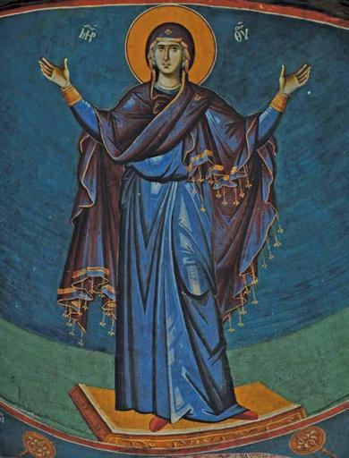 | Keywords: Virgin Orans, conch of apse.jpg mk Ф еска на Бого одица О анта конха на апсида во ц квата Св Бого одица Пе ивлепта во Ох ид акедонија en Fresco of Virgin Orans in conch of apse in Church of the Theotokos Peribleptos in Ohrid Macedonia http //www kalamus com mk/pdf_spisanija/patrimonium_2/006 20Spisanie 202008 20Zarov 2003 pdf По т ети и натписи во олта скиот п осто на Св Бого одица Пе ивлепта во Ох ид author 13 century PD-Macedonia Paintings in the Church of the Theotokos Peribleptos Orante |