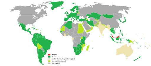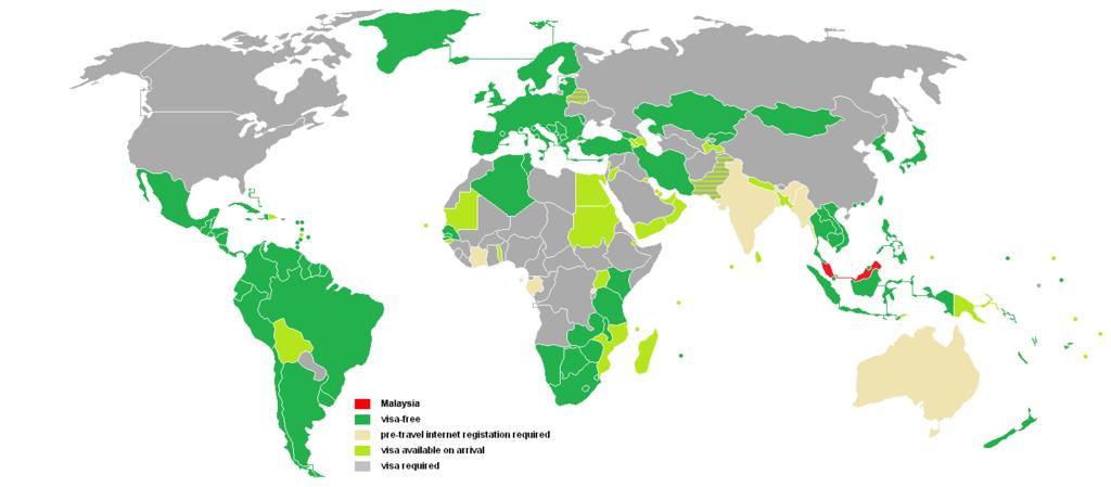 | Keywords: Visa requirements for Malaysian citizens.PNG  en Visa requirements for Malaysian citizens 2007-09-14 own User Noblesham Noblesham en Original upload log en wikipedia FtCG page en wikipedia MalaysiaVisaFree PNG wikitable - 18 42 4 March 2013 1 425 × 625 57 340 bytes bevis huang w en Not required Mexico Iraq - 18 42 11 January 2012 1 425 × 625 57 340 bytes Anggerik w en Visa required Ghana Gambia Not required Zambia On arrival Yemen North Korea - 12 25 27 March 2011 1 425 × 625 33 046 bytes Anggerik w en Visa required Senegal Zambia Not required Gambia Ghana On arrival Rwanda Bolivia - 07 46 21 February 2011 1 425 × 625 33 073 bytes Travelbird w en updates differentiate between visa-free visa-on-arrival - 14 06 25 February 2010 1 425 × 625 19 659 bytes Ozguroot w en +Sudan; VOA - 21 40 28 January 2010 1 425 × 625 19 633 bytes Ozguroot w en -Yemen - 01 04 24 January 2010 1 425 × 625 19 636 bytes Ozguroot w en - 23 49 23 January 2010 1 425 × 625 19 636 bytes Ozguroot w en Malaysia better color difference - 18 39 16 September 2009 1 425 × 625 32 953 bytes Anggerik w en Mexico - 08 58 24 June 2009 1 425 × 625 32 882 bytes Passportguy w en - 14 08 15 May 2009 1 425 × 625 33 036 bytes Passportguy w en update serval countries - 09 36 19 April 2009 1 425 × 625 33 005 bytes Passportguy w en add Montenegro visa free - 02 04 31 December 2008 1 425 × 625 33 022 bytes Rammsf w en Japan - visa required - 07 10 25 April 2008 1 425 × 625 32 979 bytes Noblesham w en Macedonia - visa free - 06 44 25 April 2008 1 425 × 625 33 003 bytes Noblesham w en Ethiopia - visa issued on arrival - 06 33 25 April 2008 1 425 × 625 32 976 bytes Noblesham w en Bangladesh - visa prior to arrival - 06 29 25 April 2008 1 425 × 625 33 048 bytes Noblesham w en Ecuador - visa free Dominican Republic - visa free Belarus - visa prior to arrival - 15 35 17 November 2007 1 425 × 625 32 992 bytes Noblesham w en - 15 32 17 November 2007 1 425 × 625 32 964 bytes Noblesham w en - 12 56 14 September 2007 1 425 × 625 32 958 bytes Noblesham w en - 12 51 14 September 2007 1 425 × 625 32 969 bytes Noblesham w en Maps showing visa requirements Malaysia |